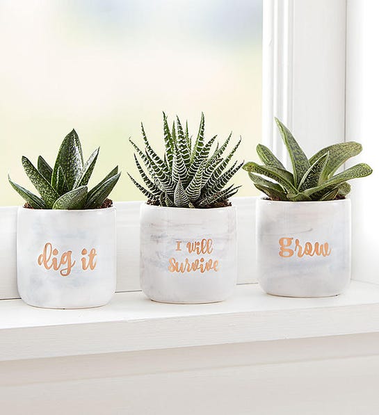 Give them as a set of three or split them up — it's up to you. Thesemini succulentsare nestled in trendy ceramic containers. There's no green thumb needed for these low-maintenance beauties!